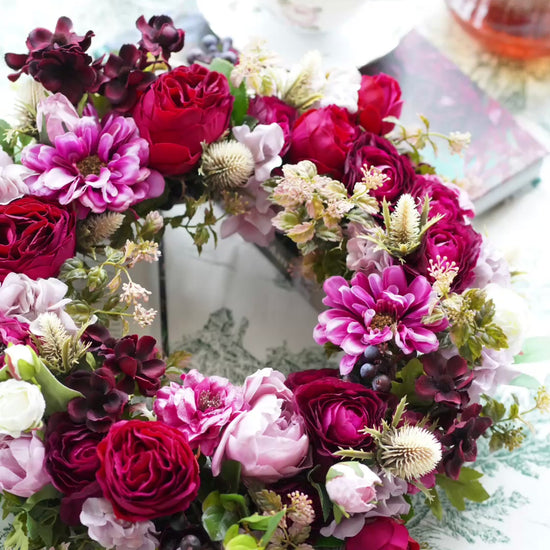 Rich tones of deep red roses, burgundy hydrangeas, soft blush peonies, and seasonal foliage are arranged to capture the warmth and elegance of the season. This luxurious wreath makes a statement whether displayed on your front door, hallway wall, fireplace mantel, or as a unique table centrepiece.